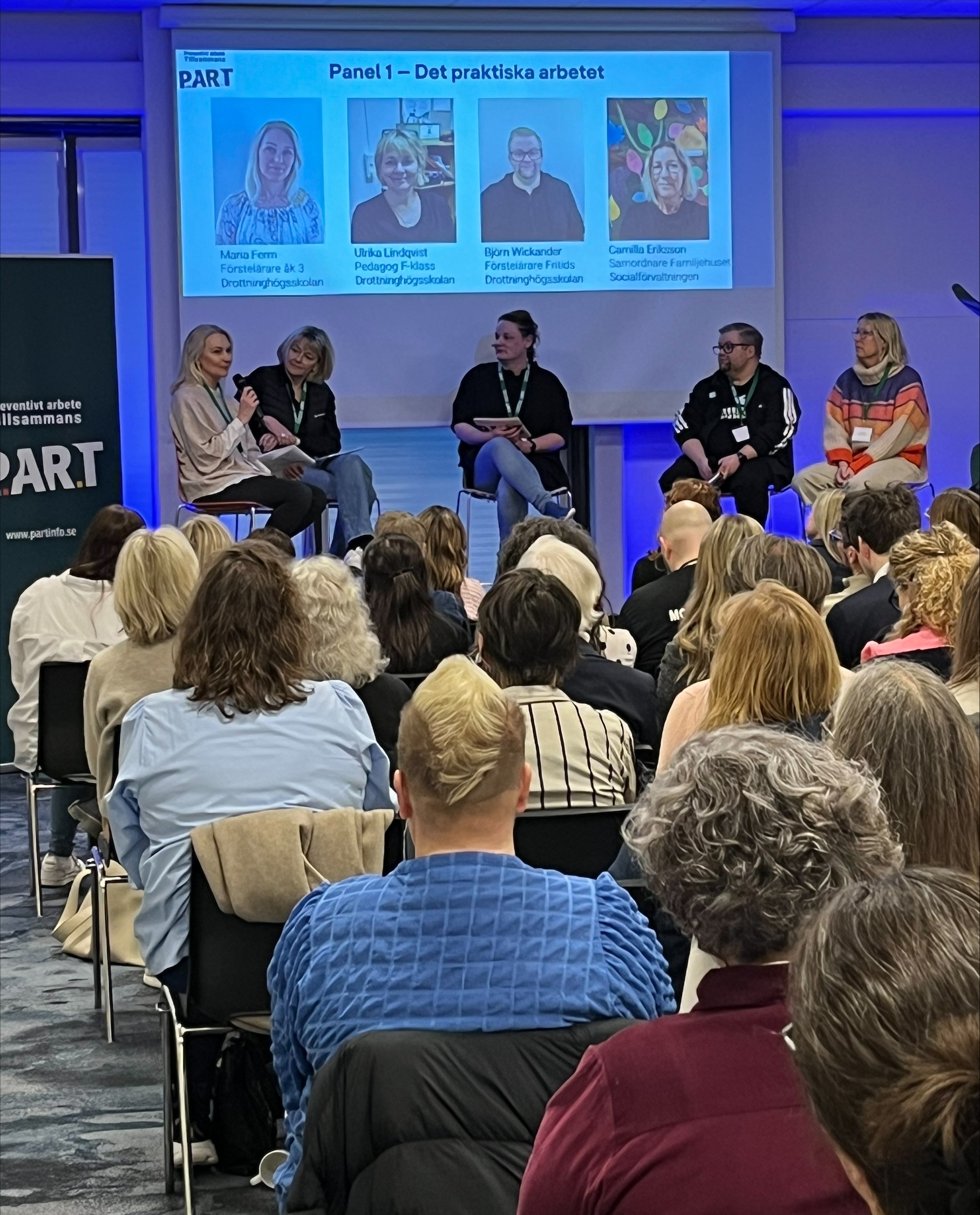 Ta del av det konkreta TSI-arbetet såhär långt och vad vi gjort, lärt, sett och tar med oss framöver. Panel 1: Ulrika Lindkvist, pedagog F-klass Drottningshögskolan, Maria Ferm, pedagog åk 3 Drottningshögskolan, Björn Wickander, förstelärare fritids/Drottningshögskolan, Camilla Eriksson, samordnare Familjehuset/Socialförvaltningen. Panel 2: Frida Sander, rektor Drottninghögskolan. Erik Bengtsson, enhetschef Socialt fältarbete/Socialförvaltningen, Jackie Rietz, kurator elevhälsan/Drottningshögskolan, Nellie Törnblom, hälsopedagog fritids, Drottningshögskolan