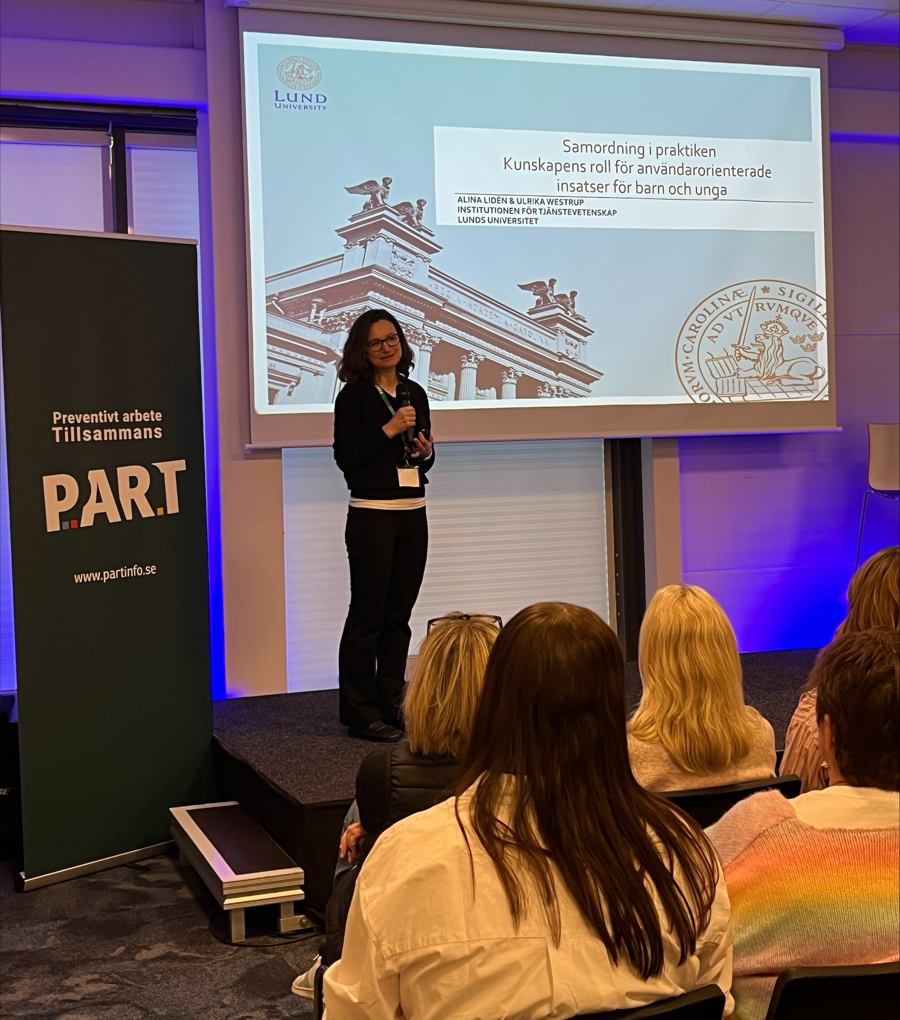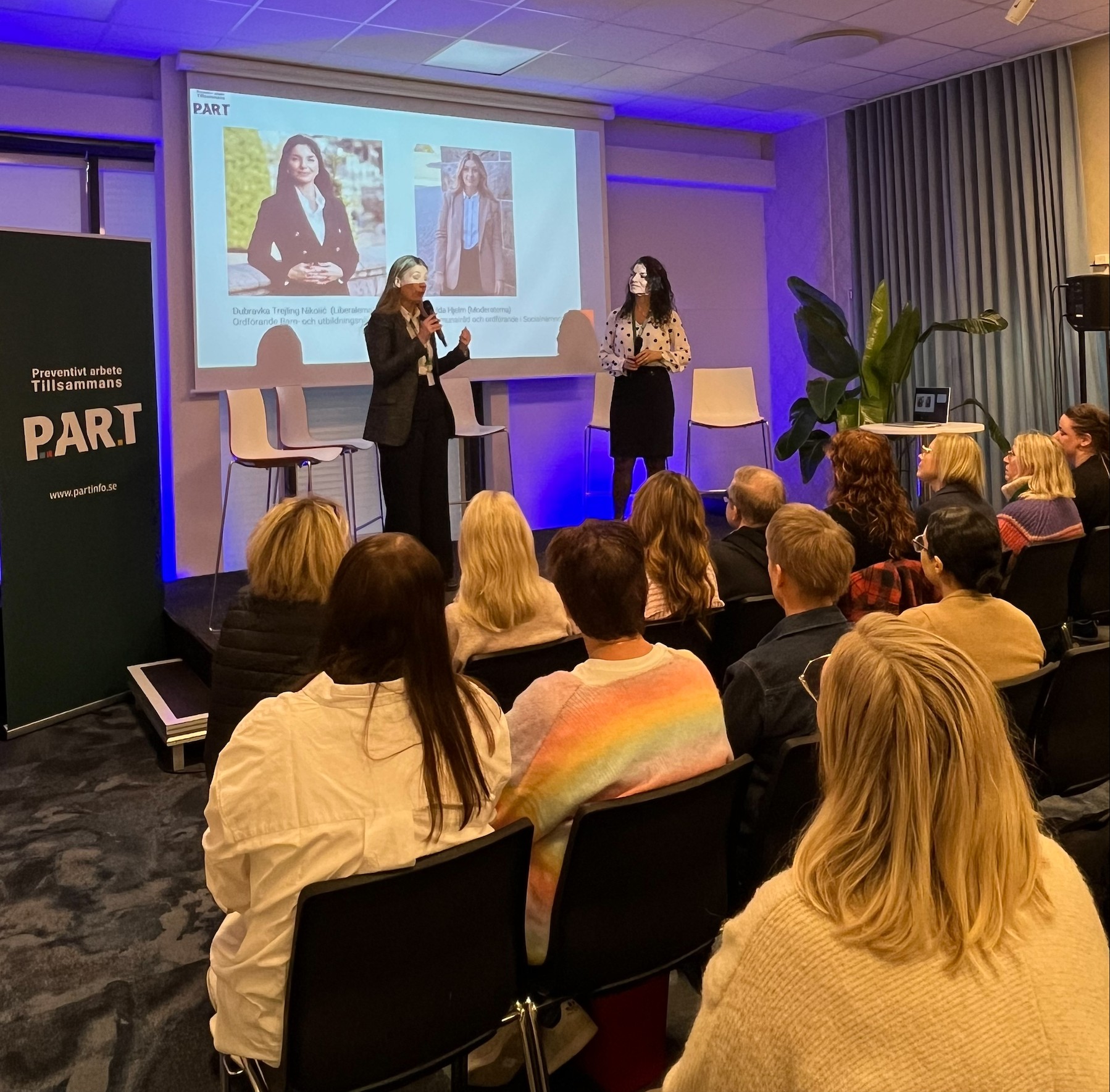 Therese Ekheim, projektledare TSI, Socialförvaltningen och Anna Haraldsson, utvecklingsstrateg PART, inleder konferensen med en introduktion till dagen och konferensens deltagare hälsas välkomna av Dubravka Trejling Nikolic, ordförande Barn- och utbildningsnämnden samt Matilda Hjelm Espelund, kommunalråd och ordförande i Socialnämnden.